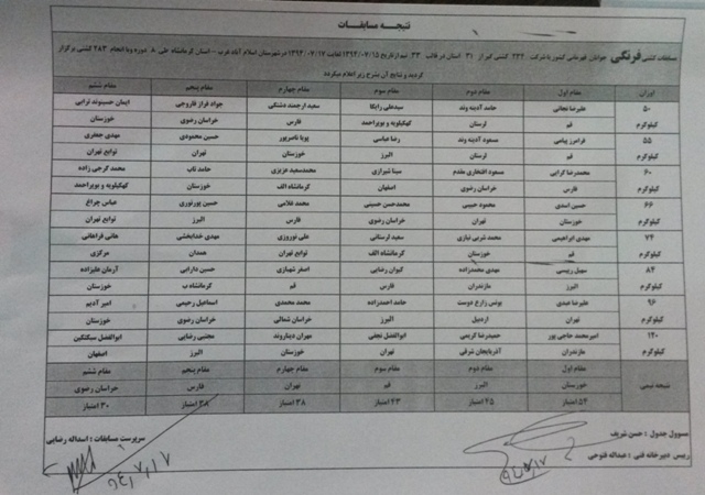 به گزارش اسلام آبادخبر، در رده بندی تیمی: ۱- خوزستان ۵۴ امتیاز ۲- البرز ۴۵ امتیاز ۳- قم ۴۳ امتیاز ۴- تهران ۳۸ امتیاز ۵- فارس ۳۸ امتیاز ۶- خراسان رضوی ۳۰ امتیاز را کسب کردند و رده بندی انفرادی براساس اوزان این رقابت ها به شرح ذیل می باشد؛