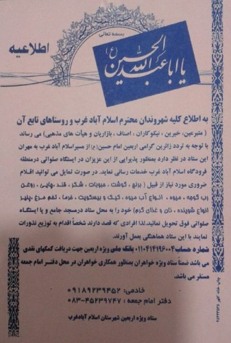 وی افزود: پرچمدار و مسئول اصلی ستاد اربعین در اسلام آبادغرب ، حجت الاسلام سیدامیر محمدی پور امام جمعه شهرستان است و فرماندار اسلام آبادغرب هم چندین بار سرکشی نموده و دستورات لازم را به ادارات ذیربط داده است، با این وجود ستاد مردمی است و ما این کار را به عشق اهل بیت(ع) و برای رضای خدا انجام می دهیم وآثار برکت آن این است که در کنار ما موکب های مردمی دیگری مثل کارکنان مانیزان برپا شده است و شنیده ام شرکت مدلل هم قصد برپایی موکب در ماهیدشت را دارند و این نشانه عشق مردم ولایتمدار اسلام آبادغرب به اهل بیت(ع) است که برای نوکری و خدمت به زوار اباعبدالله(ع) مسابقه می گذارند.